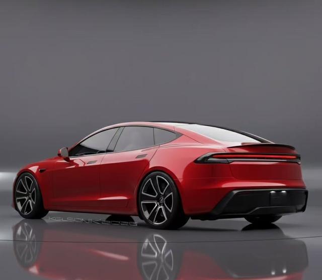 从曝光的渲染图来看,新款Model S最显著的变化集中于照明系统。车头部分,纤细的贯穿式LED灯带取代了传统的分体式大灯,与封闭式前脸形成完整的一体化视觉效果。这种设计不仅拓宽了车头的视觉宽度,也降低了整车的视觉重心,营造出更具贴地感的运动姿态。前包围线条经过重新设计,造型更为锐利,进气口处理更加简洁。